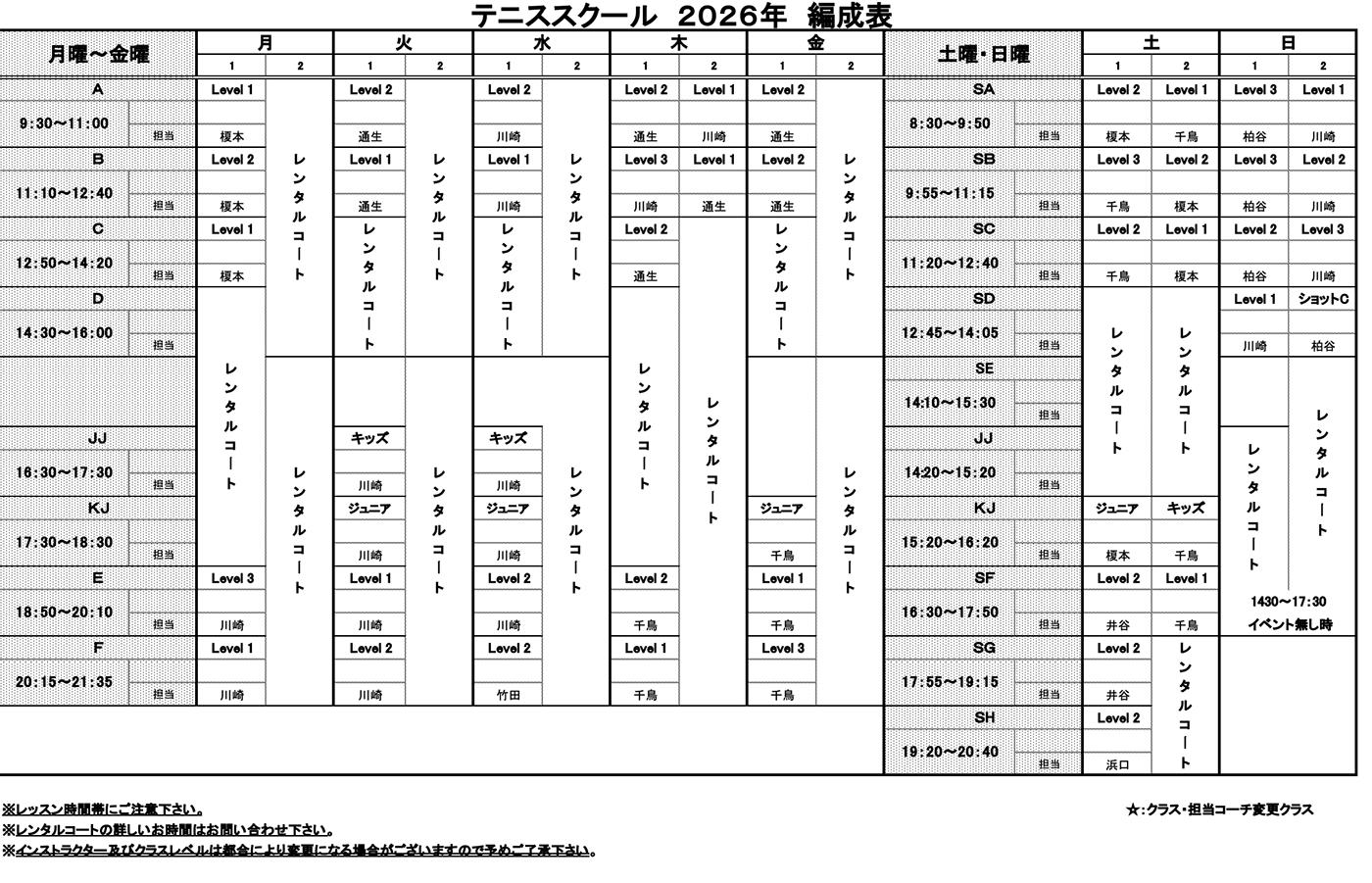 | クラス | 曜日 | 時間 | レッスン内容 |